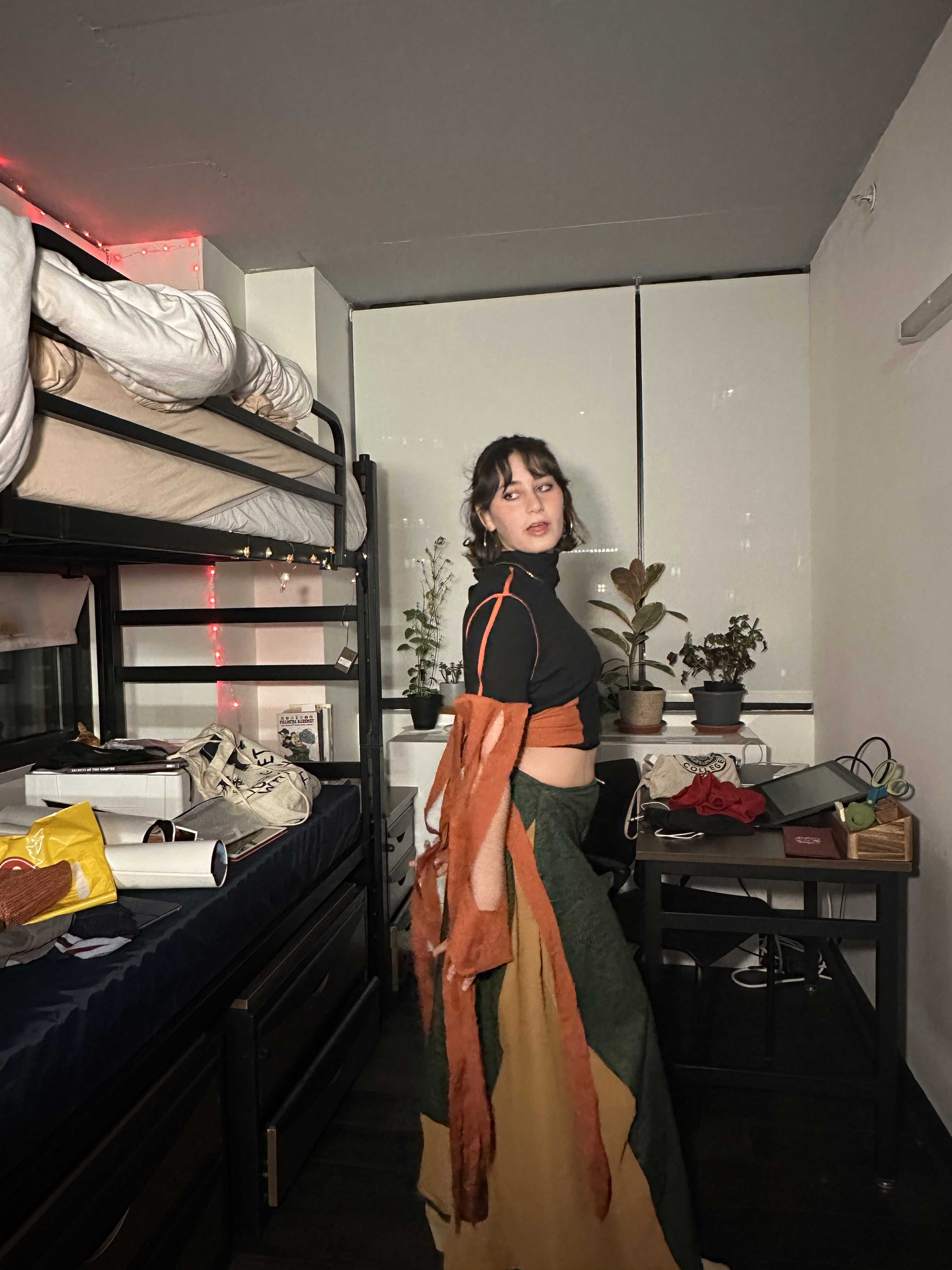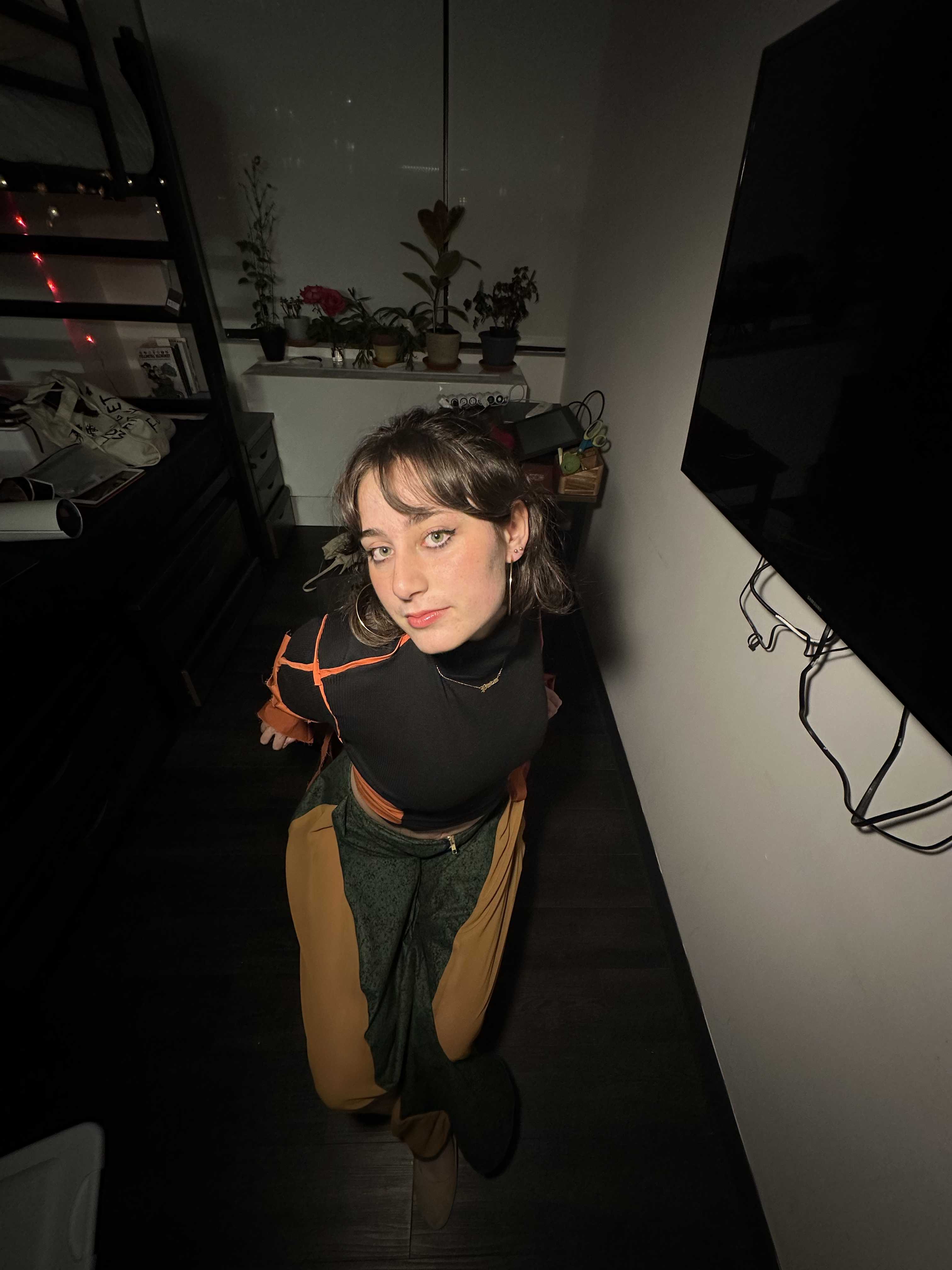 Ell wanted to show movement in her look. Experimenting with androgyny is a crucial point of her style that we worked to capture. A silhouette that’s curvy and complements an athlete while having the comfort of bagginess was what we chose to accomplish. Her aesthetic is 90s grunge, and her favorite colors include black, orange, and camo green. We decided to have the distribution of color follow the 70 20 10 rule.