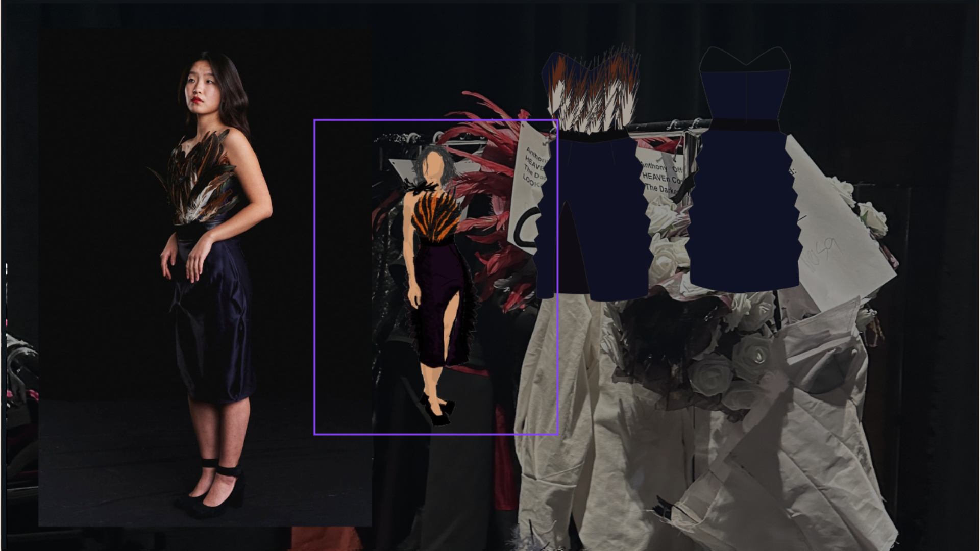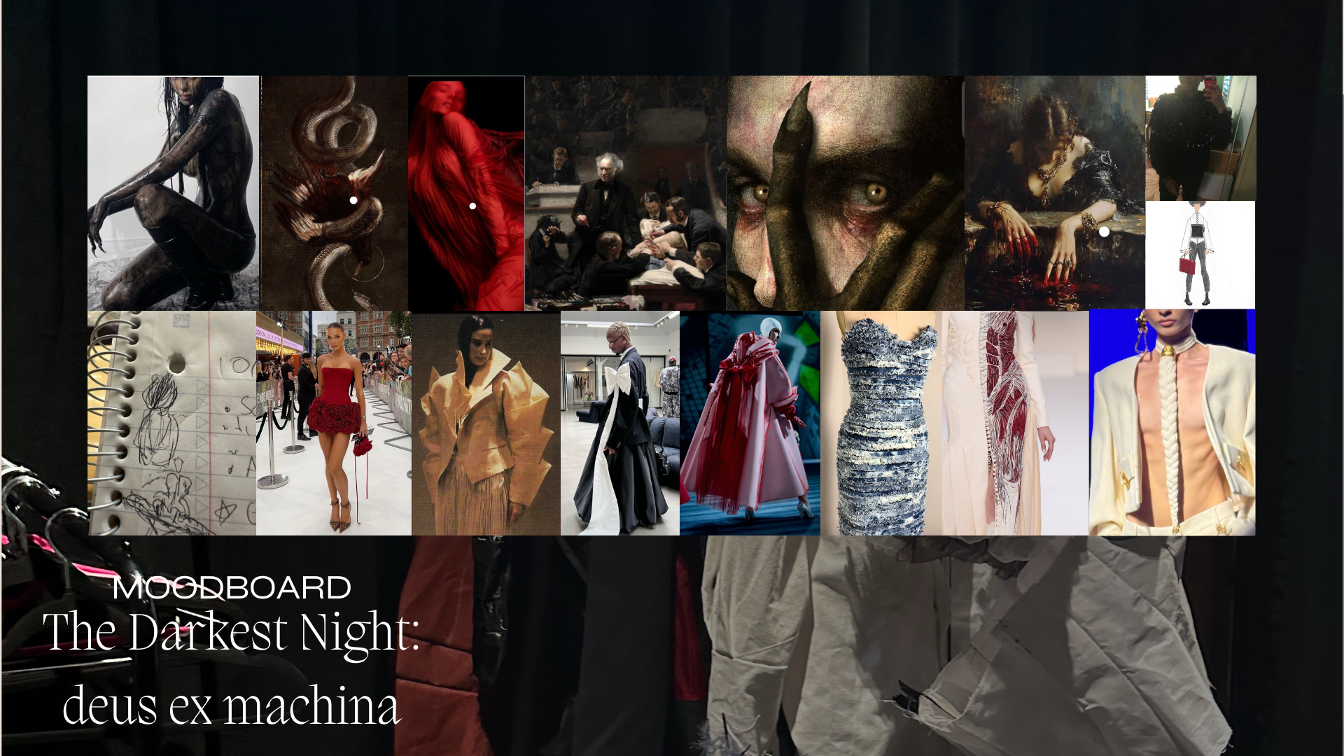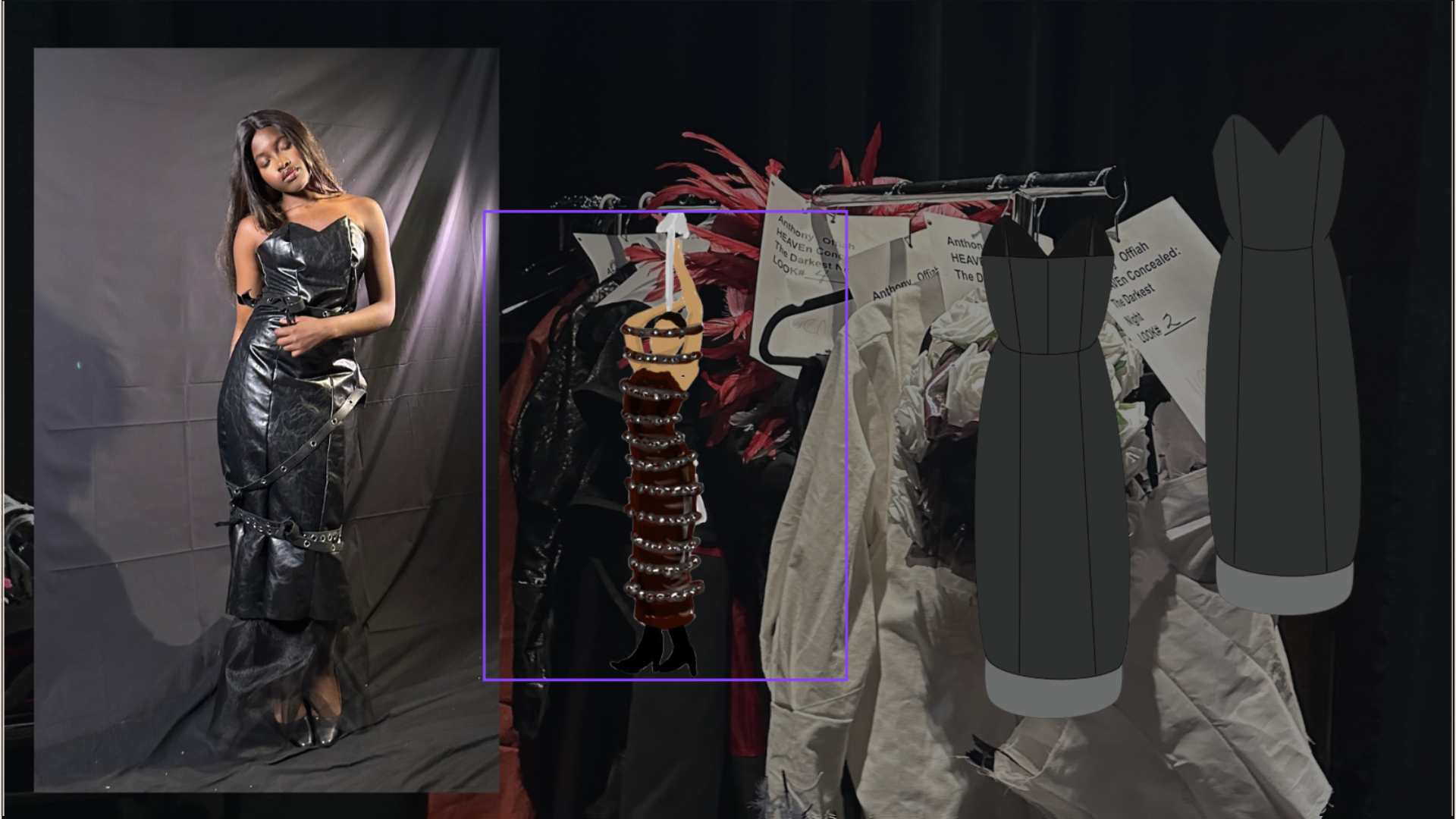 My artistic process began with me reviewing very old work I had done before I could sew. It was important that this collection be my opus as a designer and meaningfully incorporate the things I loved when I first started sketching and ideating. Something I found was a dark, moody feel, reminiscent of Alexander McQueen, an idol of mine. Creating a custom scent at Olfactory also helped me with ideating by putting me in a woeful mood. My collections all fall under the name Heaven Concealed. I came up with the name many years ago, and it represents my aversion to hegemony and religious abstractions that are the foundation for rules that define and restrict my life and work as a peculiar person and artist. I wanted to fall back on that message with a story equally as provocative. I found myself visiting galleries and researching modern art with gruesome undertones. A favorite of mine is The Clinic of Dr. Gross by Thomas Eakins.